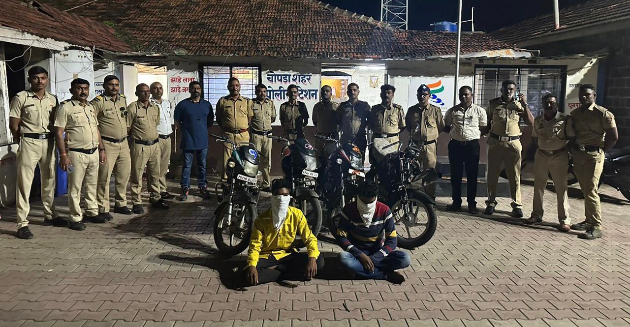 याबाबत सविस्तर वृत्त असे की, वरीलप्रमाणे दाखल गुन्ह्याचे तपासी अंमलदार पोहेकॉ. शेषराव तोरे यांनी सदर गुन्ह्यात आरोपी 1) पवन संजय साळुंखे, रा. सुंदरगढी चोपडा तसेच 2) अमोल राजेंद्र अहिरे, रा. खडगांव ता.चोपडा यांना अटक करुन व एका अल्पवयीन आरोपीस ताब्यात घेवुन विचारपुस केली असता त्यांनी सदर गुन्ह्यातील चोरीस गेलेली मोटार सायकल 1) एमएच 18 एएम 8666 एच. एफ डिलक्स मोटार सायकल याव्यतिरीक्त 2) एमएच 19 बीबी 5004 हिरो होंडा कंपनीची पॅशन प्रो मोटार सायकल व 3) एमपी 10 एनए 3444 एच एफ डिलक्स व 4) विना क्रमांकाची लाल काळ्या रंगाची एचएफ डिलक्स मोटार सायकल अशा एकुण चार मोटरसायकली अंदाजे 1,20,000/- रुपये किंमतीच्या चार मोटरसायकली हस्तगत करण्यात आल्या. सदर चोरीच्या गुन्ह्यात आरोपी क्रं. 1 व 2 यांना अटक करुन त्यांना न्यायालयासमोर हजर केले असता दिनांक 31/07/2023 पावेतो पोलीस कस्टडी मिळाली आहे. सदर आरोपीतांनी याव्यतिरीक्त अजुन गुन्हे केलेले असण्याची शक्यता नाकारता येत नाही. त्यामुळे त्यांच्याकडून आणखी इतर गुन्हे उघडकीस येण्याची शक्यता आहे.