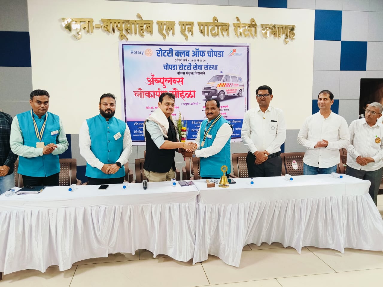 रोटरी भवन येथे झालेल्या रुग्णवाहिका लोकार्पण प्रसंगी रोटरी डिस्ट्रिक्ट ३०३० चे भावी प्रांतपाल रोटे. डॉ. राजेश पाटील (जळगाव) यांची प्रमुख उपस्थिती होती. याप्रसंगी मंचावर क्लबचे अध्यक्ष डॉ. ईश्वर सौंदाणकर, सचिव भालचंद्र पवार, कोषाध्यक्ष प्रदीप पाटील, क्लबचे भावी अध्यक्ष आशिष जयस्वाल, सचिव विश्वास दलाल, कोषध्यक्ष निखिल सोनवणे, रोटरी सेवा संस्थेचे सचिव विलास एस. पाटील, प्रकल्प मार्गदर्शक नितीन अहिरराव व या रुग्णवाहिकेचे संचालन करणारे डॉ. दुर्गेश जयस्वाल हे उपस्थित होते. रोटरी रुग्णवाहिका जयस्वाल हॉस्पिटल चे संचालक डॉ. दुर्गेश जयस्वाल यांना सुपूर्त करण्यात आली ह्यावेळी सर्व रोटरी सदस्य बंधू-भगिनींच्या चेहऱ्यावर स्वप्नपूर्ती झाल्याच्या आनंद दिसून आला. याप्रसंगी डॉ. राजेश पाटील, आशिष गुजराथी, नितीन अहिरराव यांनी मनोगते व्यक्त केली तर सूत्रसंचालन संजय बारी यांनी व प्रास्ताविक डॉ. सौंदाणकर यांनी व आभार प्रदर्शन भालचंद्र पवार यांनी केले.