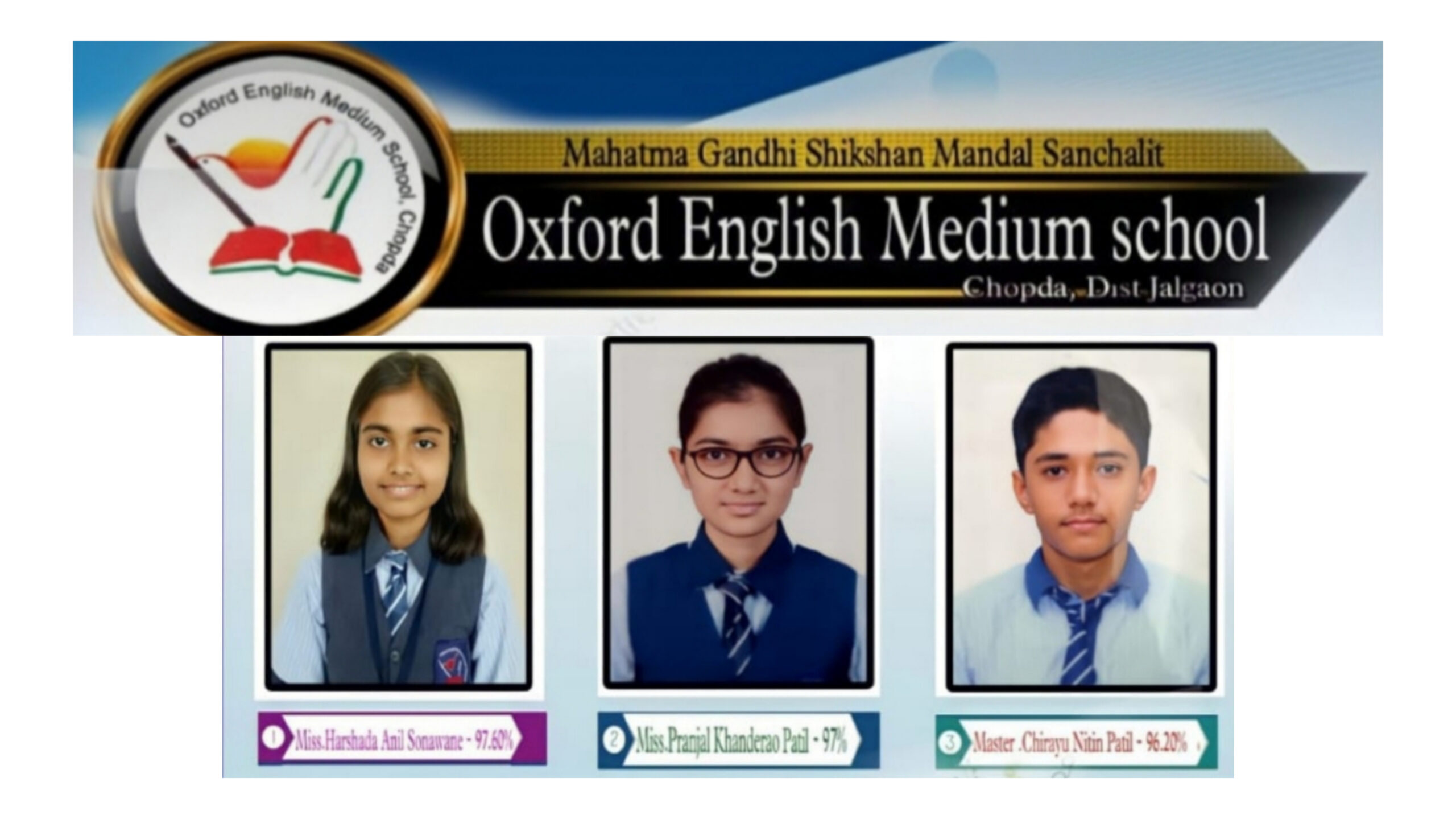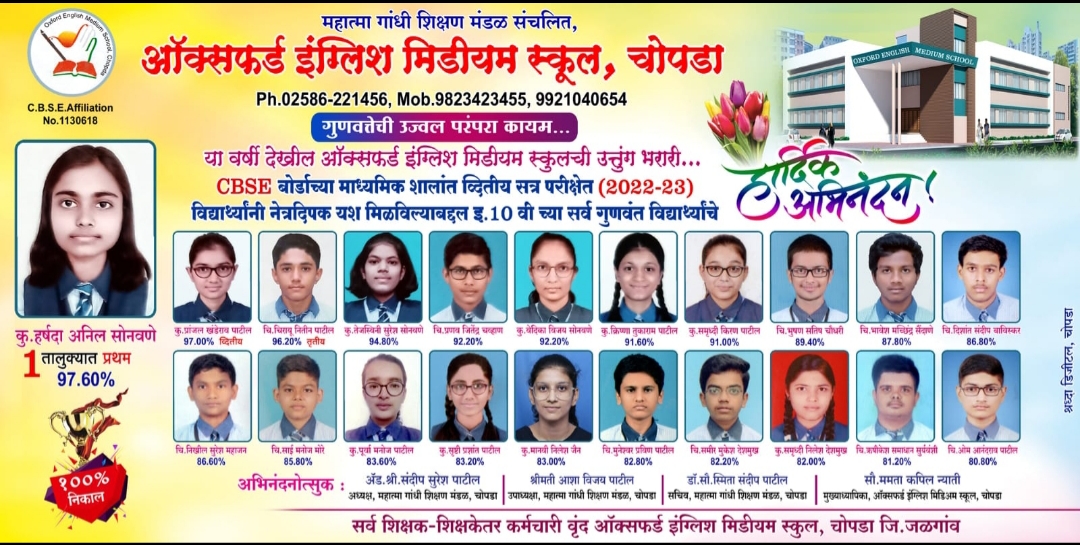 लोकप्रवाह, चोपडा दि. २४ जुलै – येथील महात्मा गांधी शिक्षण मंडळ संचलित ऑक्सफर्ड इंग्लिश मीडियम स्कूल या सीबीएसई बोर्डाशी संलग्नित शाळेचा दहावीच्या द्वितीय सत्र परीक्षेचा निकाल बोर्डातर्फे नुकताच जाहीर झाला आहे. यात शाळेच्या विद्यार्थ्यांनी घवघवीत यश संपादन केले आहे. मागील ४ वर्षाप्रमाणे यंदाही सीबीएसई परीक्षेत तालुक्यात प्रथम येण्याचा मान विद्यालयाने पटकाविला आहे.